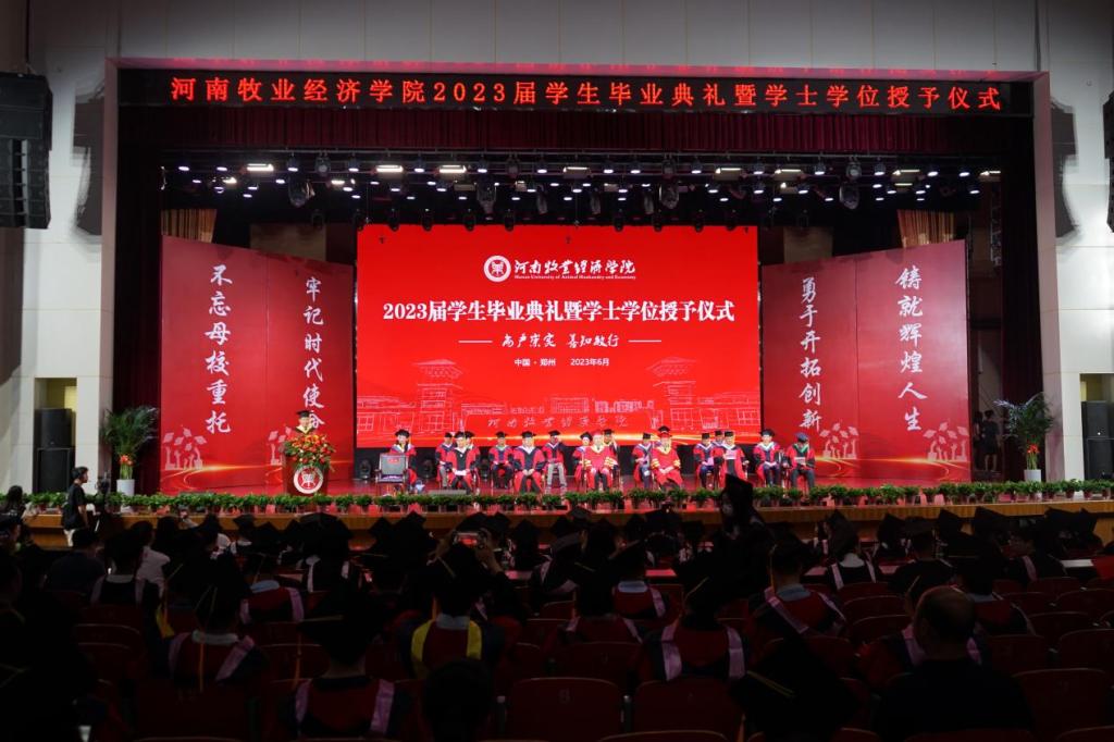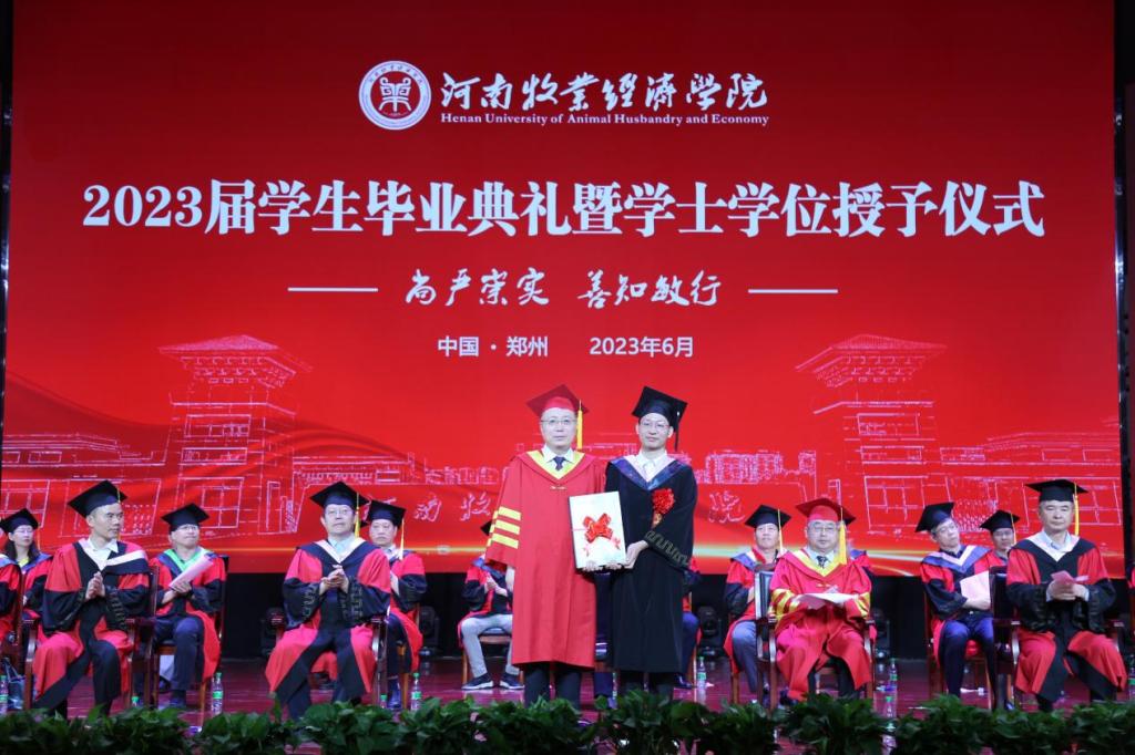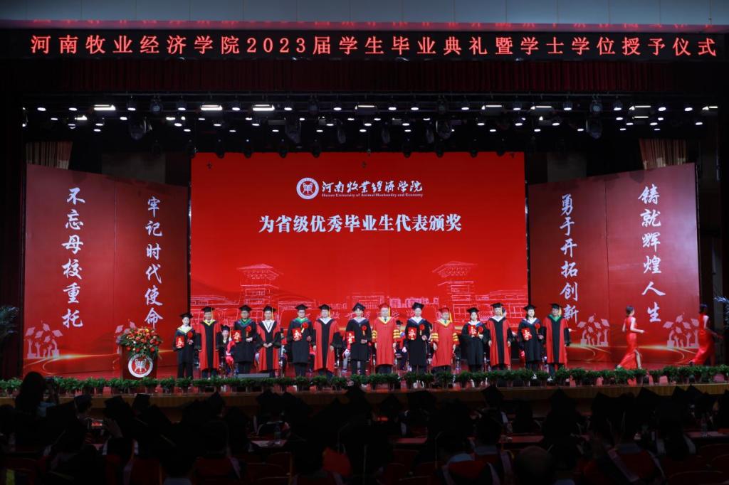 毕业典礼上,校党委副书记李俊杰宣读了威尼斯官网荣获2023年河南省优秀应届大学毕业生名单;副校长杨国宇宣读了《关于授予贾峥等5820名2023届普通本科毕业生学士学位的决定》;与会校领导分别为毕业生代表颁发毕业证、学位证,拨穗正冠;为省级优秀毕业生代表颁发荣誉证书;为考取研究生、西部计划、参军入伍等优秀毕业生代表颁发奖金;为全体毕业生代表赠送了毕业纪念品。