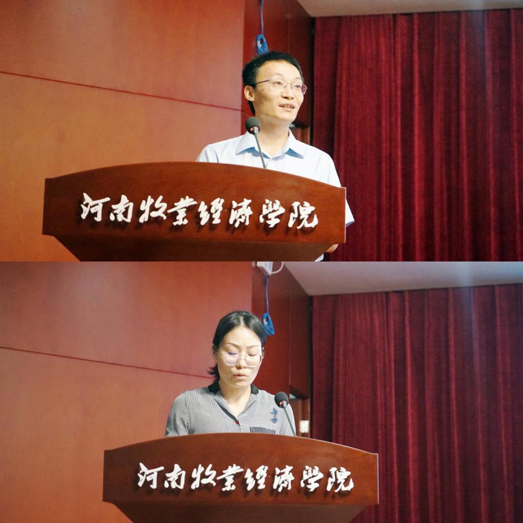 仪式上,与会领导为新进教师代表授戴校徽;教师发展中心主任王永芬介绍了2023年新入职教师岗前培训安排和相关要求;教师发展中心副主任张德春带领全体新入职教师进行了入职宣誓;2023年校级教学技能竞赛一等奖获得者、国家自科基金获得者动物科技学院车龙博士,新进教师代表、金融与会计学院刘翠博士分别发言。