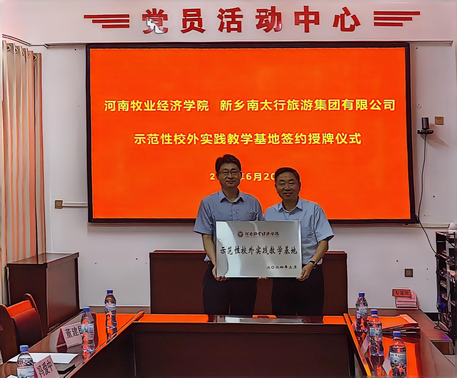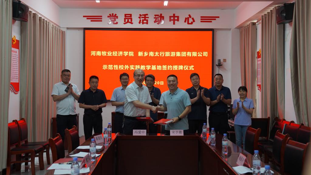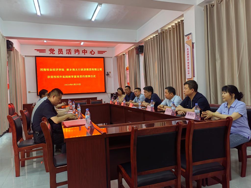 6月20日,学校与新乡南太行旅游集团有限公司合作签约暨实践教学基地授牌仪式在新乡市辉县举行。威尼斯官网副校长杨国宇、边传周,新乡南太行旅游集团有限公司副总经理、财务总监冯爱中等领导出席签约授牌仪式。学校教务处、动物医药学院等相关职能部门、学院负责同志参加仪式。