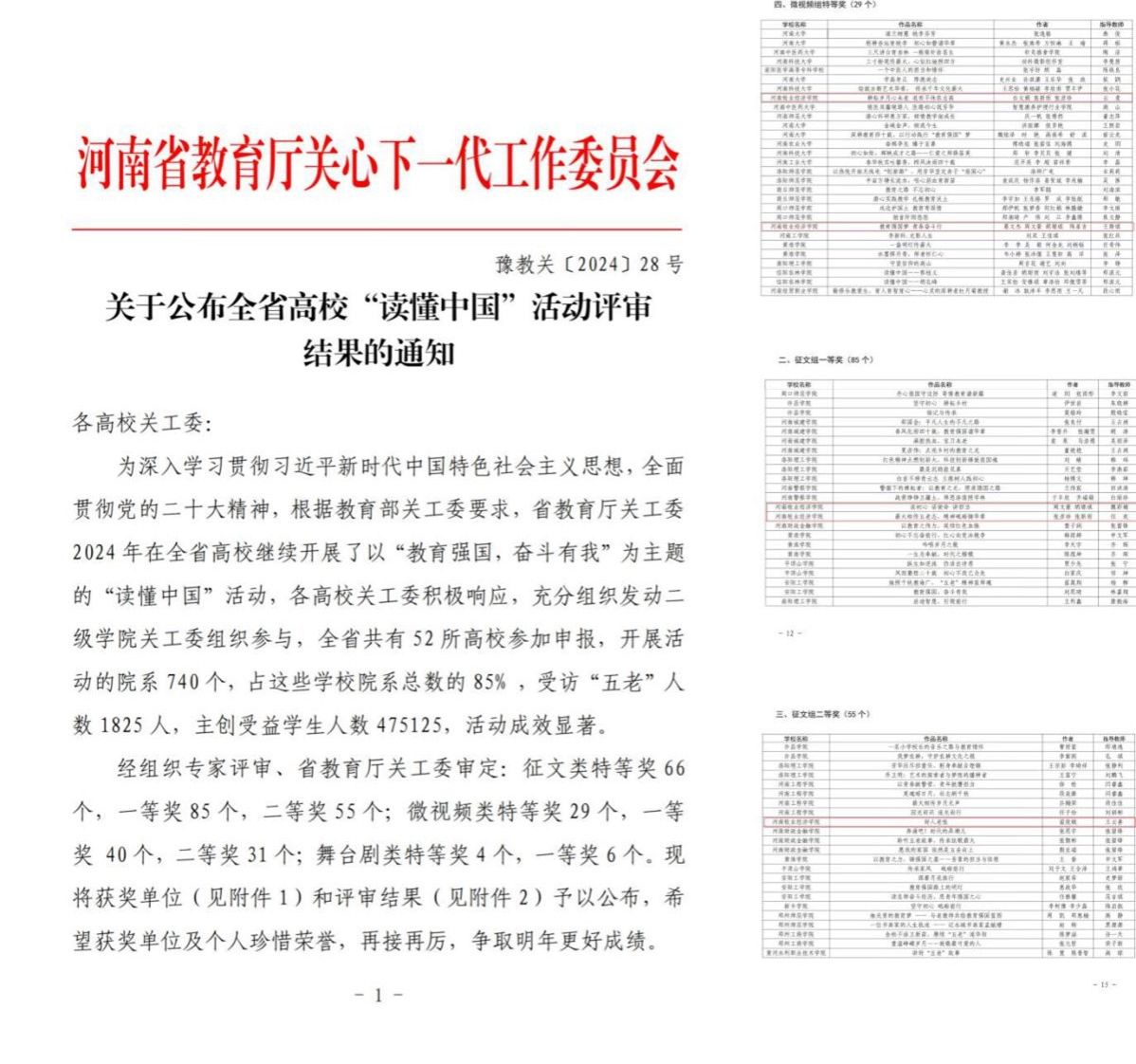 近日,河南省教育厅关工委发布了《关于公布全省高校“读懂中国”活动评审结果的通知》,威尼斯官网选送的微视频作品凭借感人的事迹和精湛的剪辑荣获特等奖,三篇征文作品荣获两项一等奖,一项二等奖。这是近年来威尼斯官网在该活动中取得的最好成绩。