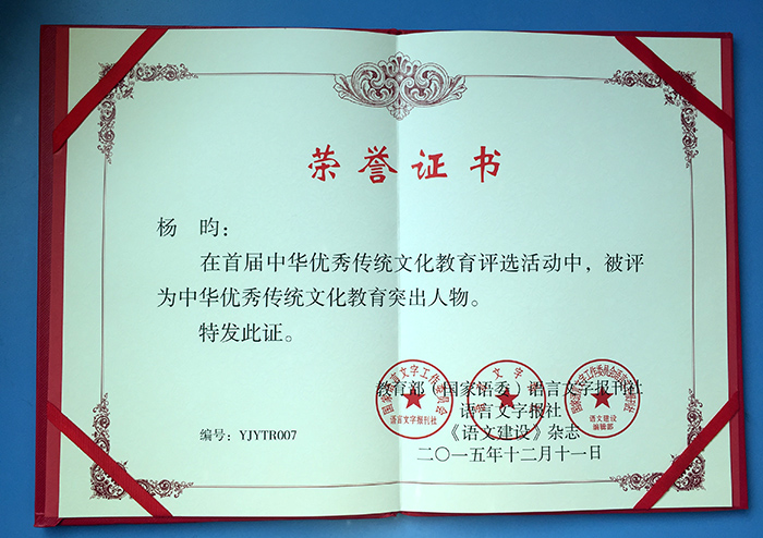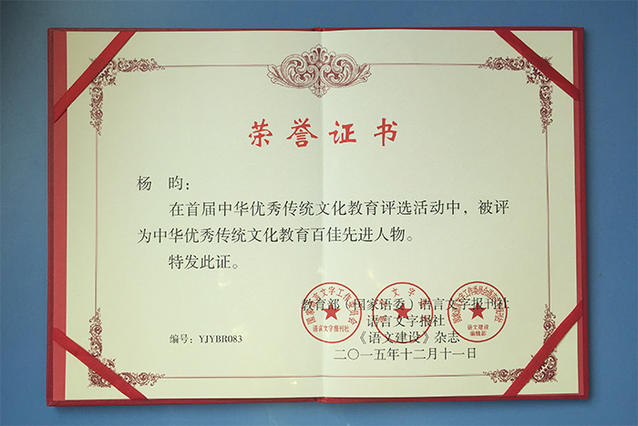 2015年12月,在教育部(国家语委)语言文字报刊社、语言文字报社等单位组织的“首届中华优秀传统文化教育评选活动”中,基础部大学语文教研室教师积极参与、共同努力,最终威尼斯官网被评为“中华优秀传统文化教育百佳实验单位”,杨昀老师获得“首届中华优秀传统文化教育突出人物”和“中华优秀传统文化教育百佳先进人物”称号。