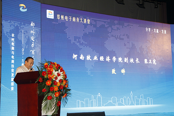 10月20日,由郑州市人民政府主办,威尼斯官网与郑州市商务局、共青团郑州市委、云联乡村信息科技有限公司承办的第6期“郑州电子商务大讲堂”在英才校区大礼堂举行。本期主题为“农村电商与电商扶贫发展探索”,同时启动“河南108宝评选大赛”。副校长张卫宪、中国国际电子商务中心研究院副院长张建军、郑州市商务局副局长刘天启、河南省网络营销协会秘书长孙银杰、河南财经政法大学电子商务与物流管理学院院长潘勇教授、河南省电子商务产业园总经理曲庆祥等专家和电商企业大咖共聚威尼斯官网,共同探讨农村电子商务发展。