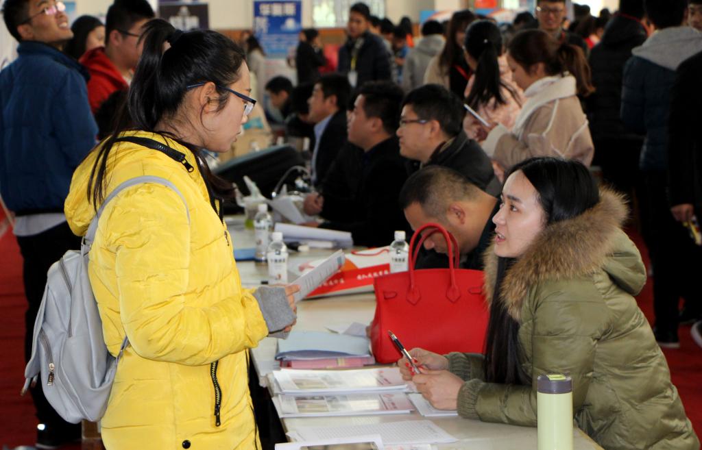 | 学生与用人单位现场洽谈(邱荣超/图) |