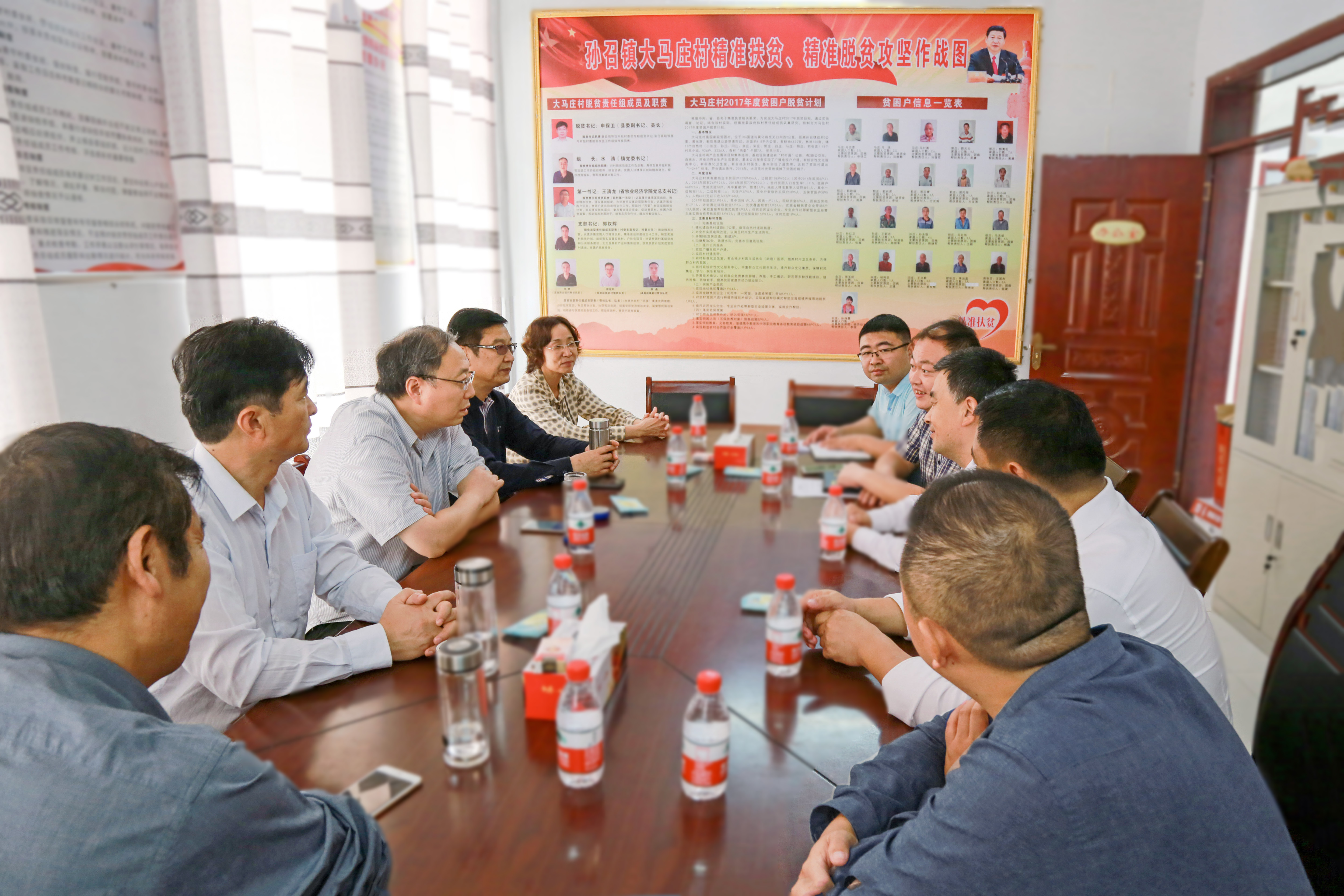 穆瑞杰与县、镇、村领导亲切座谈交流。在大马庄村委会会议室,听取大马庄村的发展变化汇报后,穆瑞杰表示:学校充分利用高校人才资源和技术优势,着重做好教育扶贫,坚持物质脱贫和精神脱贫并举,尽可能的为帮扶村、贫困户办实事、办好事。大马庄村于2016年底已经脱贫,但尚有为数不多的贫困户仍然生活在贫困线以下,争取早日实现完全脱贫,共同富裕。校领导还了解了大马庄村的党建工作、翻阅了贫困户资料、查看了新建食堂等。
