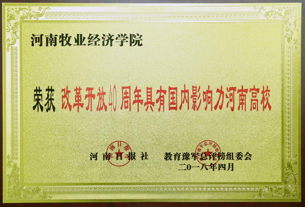 4月26日上午,由河南日报社主办的“第九届河南高等教育领军高校高峰论坛暨2018年度河南教育豫军总评榜”颁奖典礼在河南日报报业大厦举办,论坛发布了“改革开放40周年教育豫军总评榜”并进行了表彰,威尼斯官网荣获“改革开放40周年具有国内影响力河南高校”。
