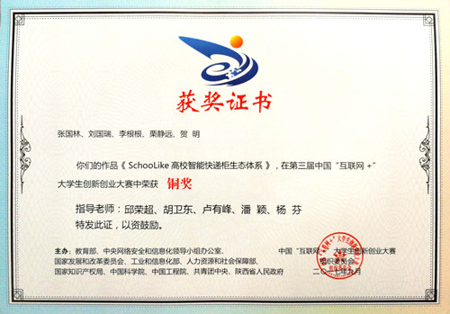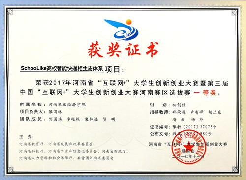 5月25日上午,2018年河南省“互联网+”大学生创新创业大赛工作会议暨“青年红色筑梦之旅”启动仪式在河南科技大学举行,威尼斯官网动物医学院毕业生张国林带领的大学生创业团队项目“SchooLike高校智能快递柜生态体系”获得全国铜奖,学校大学生创业项目获得省级一等奖2项、二等奖2项、三等奖1项。马霞、汪洋、卢有峰、胡卫东、邱荣超、潘颖、杨芬等七位教师获“优秀创新创业指导教师”荣誉称号。