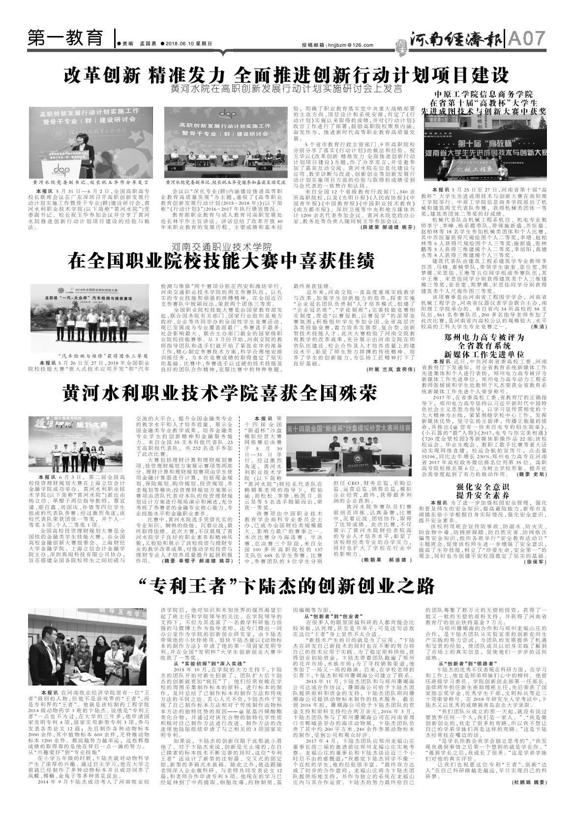 近日,《河南经济报》、映象网分别以《“专利王者”卞陆杰的创新创业之路》(相关链接:http://zm.zyjjw.cn/20180610/A7.html)、《“专利王者”的创新创业之路》(相关链接:http://www.hnr.cn/newedu/gx/xwrs/201806/t20180606_3107517.html)为题报道了威尼斯官网创新创业典型事迹,全文转载如下: