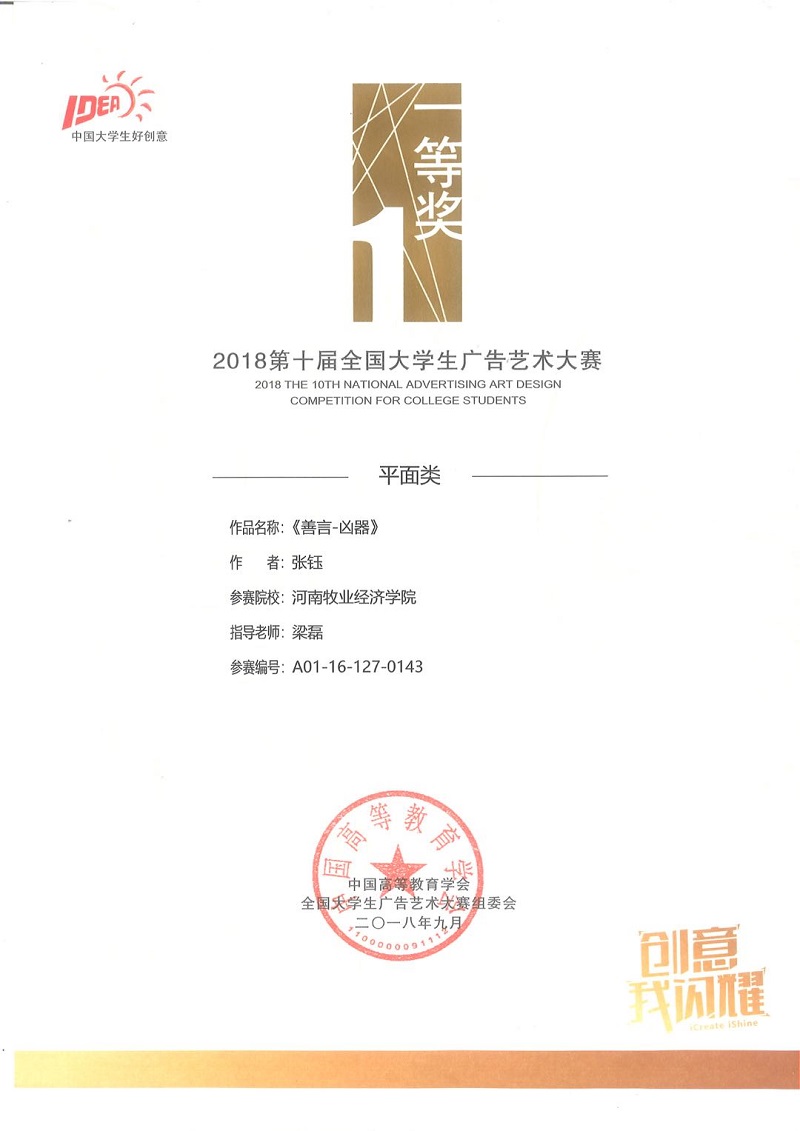 “大广赛”是迄今为止全国覆盖研究生、本科生、专科生,规模最大、人数最多、水准最高的国家级大学生赛事。本届大赛的主题为“创意我闪耀”,在各省、市、自治区、直辖市共设置了29个赛区。在前期已经结束的“大广赛”河南赛区大赛中,威尼斯官网艺术学院学生参赛成绩喜人,获得全省一等奖1项、三等奖11项、优秀奖28项,梁磊和彭辉两名教师被评为“优秀指导教师”;威尼斯官网张钰同学的作品《善言凶器》继河南赛区评比中获得一等奖后,在全国总决赛中又从16.7万组平面作品中脱颖而出,获得总决赛平面类全国一等奖。此外,威尼斯官网还有2名学生参赛作品获得全国优秀奖。