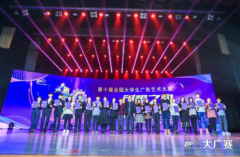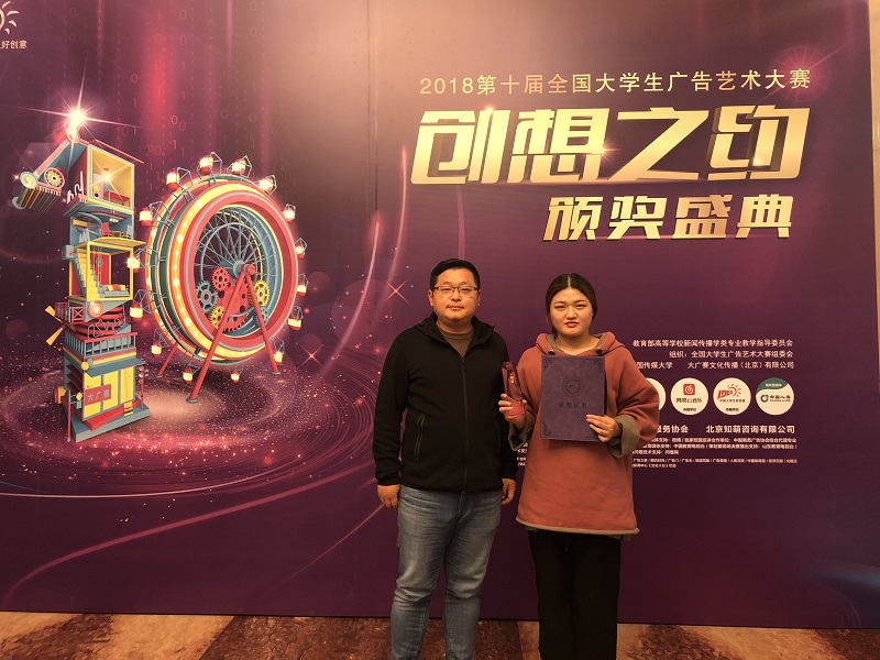 11月24日,由教育部高等教育司主办、教育部高等学校新闻学学科教学指导委员会组织、中国传媒大学与中国高等教育学会广告教育专业委员会共同承办的第十届全国大学生广告艺术大赛(简称“大广赛”)全国总决赛颁奖典礼在北京全国政协礼堂举行,威尼斯官网艺术学院张钰同学参赛作品荣获总决赛平面类全国一等奖,并应邀和指导老师梁磊一道赴京参加颁奖盛典。
