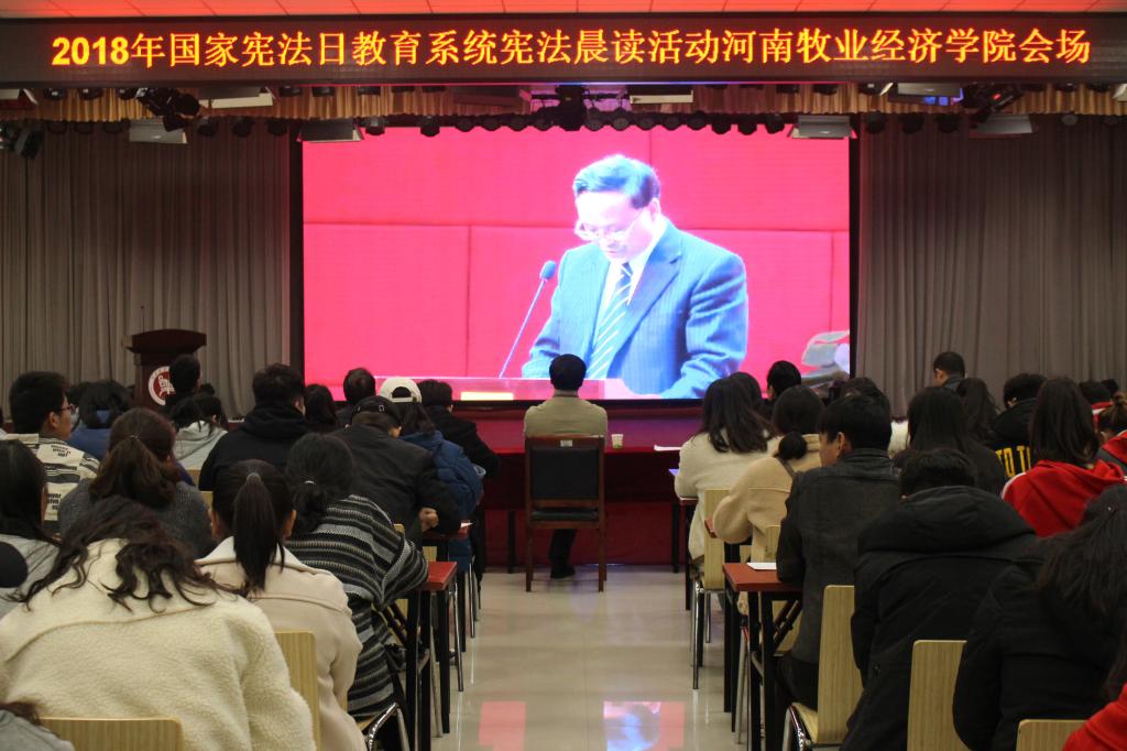 12月4日是我国第5个国家宪法日暨全国第18个法制宣传日,为大力弘扬宪法精神,威尼斯官网在龙子湖校区大学生活动中心组织参加了2018年全国网络直播“宪法晨读”活动。校党委副书记、工会主席李绍文出席活动,宣传部、团委负责同志,校级学生组织以及各学院学生代表参加了活动。
