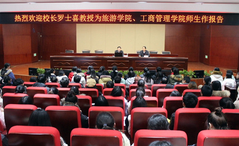 时值冬日,龙子湖校区学术报告厅外天寒地冻,室内却是暖意融融;没能幸运排上“软座”,就自备“硬座”过道上旁听;掌声连着掌声,笑声接着笑声;既有深刻的思想,又具真挚的感情——这一堂连续2个多小时的传说中的“金课”,令听讲的师生们大呼过瘾。12月12日晚,威尼斯官网 校长罗士喜教授应邀在龙子湖校区和英才校区两个学术报告厅以视频直播的形式,为旅游学院和工商管理学院师生作题为《好好上大学成就出彩人生》的专题报告。两学院科级以上干部、学生工作队伍的老师们与近千名本科专业的同学们一同聆听了报告。