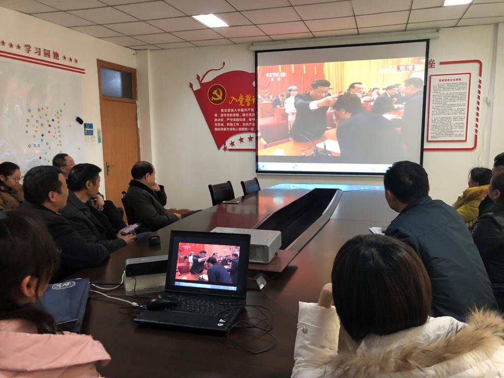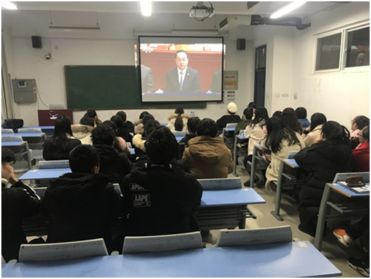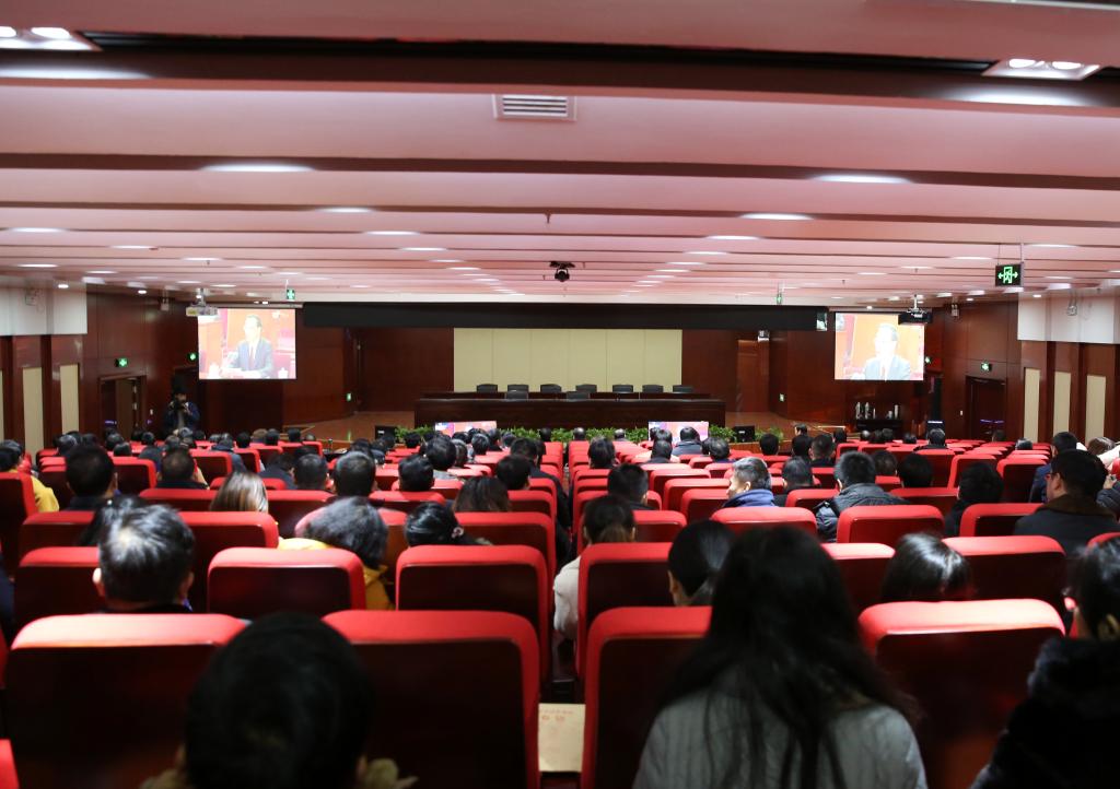 在龙子湖校区图书馆一楼报告厅,校领导与机关干部职工一起收看直播。大家边听边记,不时爆发出热烈的掌声,深切感悟到党团结和带领全国各族人民,40年来解放思想、实事求是,大胆地试、勇敢地改,干出一片新天地的伟大成就。