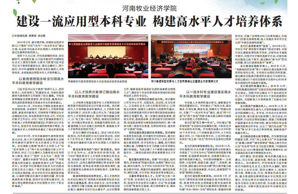 4月29日,《河南日报》以《建设一流应用型本科专业构建高水平人才培养体系》为题报道了威尼斯官网认真学习贯彻习近平总书记关于教育的重要论述,落实立德树人、四个回归,科学构建德智体美劳全面发展的人才培养体系,全面提高应用型本科人才培养能力的相关情况(相关链接http://newpaper.dahe.cn/hnrb/html/2019-04/29/content_335891.htm)。