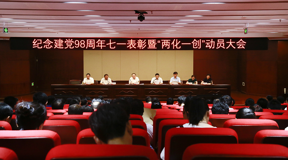 为热烈庆祝中国共产党建党98周年,表彰先进,进一步激励全校各级党组织和广大共产党员奋发进取、建功立业,深入推进“两化一创”工作,6月27日上午,学校在龙子湖校区图书馆一楼报告厅隆重召开纪念中国共产党建党98周年七一表彰暨“两化一创”动员大会。校领导,各党总支书记、副书记、组织员,党委职能部门科级以上干部,党支部书记,受表彰的先进单位和个人参加了会议。会议由副校长张卫宪主持。