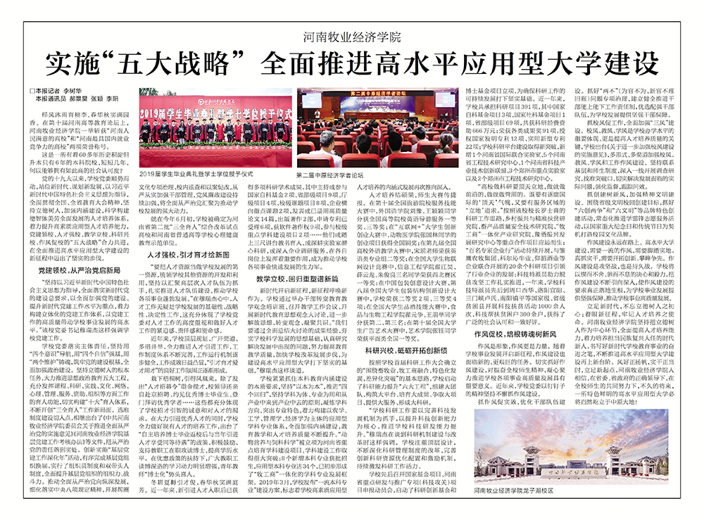 7月1日,《河南日报》以《实施“五大战略” 全面推进高水平应用型大学建设》为题报道威尼斯官网全面贯彻全国、全省教育大会精神,坚持立德树人,加强内涵建设,科学构建德智体美劳全面发展的人才培养体系,着力提升高素质应用型人才培养能力,全面推进高水平应用型大学建设相关情况。(相关链接:http://newpaper.dahe.cn/hnrb/html/2019-07/01/content_350227.htm?from=timeline)全文转载如下: