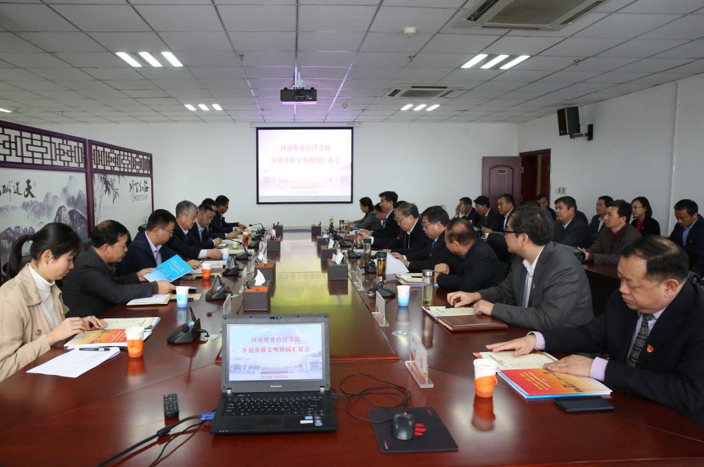 校党委书记穆瑞杰作学校文明校园创建工作汇报。他指出,近年来,学校坚持以习近平新时代中国特色社会主义思想为指导,深入学习贯彻党的十九大精神,树牢“四个意识”,坚定“四个自信”,坚决落实“两个维护”,聚焦为党育人、为国育才,突出党的政治建设,紧扣立德树人根本任务,围绕学校中心工作,把省级文明校园创建作为培养高素质人才、提升办学水平、推进高水平应用型大学建设的基础性工作常抓不懈,取得了明显成效。主要体现在七个方面,一是思想道德建设扎实有力、广泛有效;二是领导班子团结坚强有力、勤政廉洁;三是注重教师师德师风建设,社会评价高;四是校园文化丰富多彩、健康向上;五是校园环境整洁优美、和谐有序;六是活动阵地导向正确、育人有效;七是文明校园创建成效显著、组织有力。