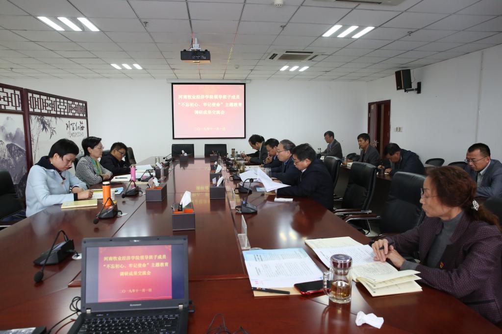 11月1日下午,学校领导班子在龙子湖校区841会议室召开“不忘初心、牢记使命”主题教育调研成果交流会。省委第十三巡回指导组组长杨健燕,指导组成员张治胜、陈洁到会指导,校党委书记穆瑞杰主持,校领导罗士喜、李波、李中华、张伟、陈艳、程慎等参加会议。