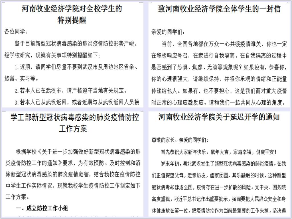 全校学生工作队伍开启网上上班模式,各学院辅导员、班主任老师充分利用微信群、QQ 群、电话等形式及时将上级及学校有关通知要求、信息提醒等传达到每位学生;学工部先后发送《9778818威尼斯对全校学生的特别提醒》、《关于延迟开学的通知》、《致全体学生的一封信》,及时对学生开展疫情防控和思想教育工作,指导学生在做好防疫工作的同时加强学习和锻炼。做好假期值班和信息上报工作,指导各学院全面掌握学生的假期动向和健康状况,与湖北籍、或有湖北往来史、或有与湖北往来人员接触史的学生逐一联系,建立学生行踪和健康台账,实施日报告和零报告制度。与校团委、大学生心理健康教育中心一起制定了《学工部新型冠状病毒感染的肺炎疫情防控工作方案》和《9778818威尼斯学生新型冠状病毒感染的肺炎疫情防控与诊治工作指引》,与后勤处、校医院一起认真做好学生返校前有关准备工作。