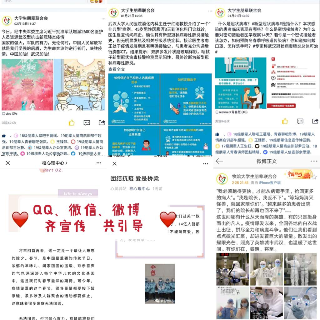 战“疫”打响后,各学院心理健康教育二级工作站积极响应校大学生心理健康教育中心的号召,积极开展防疫知识宣传,加强对学生的心理关怀和疏导,为威尼斯官网学生筑牢心理防线,提升心理免疫力保驾护航。