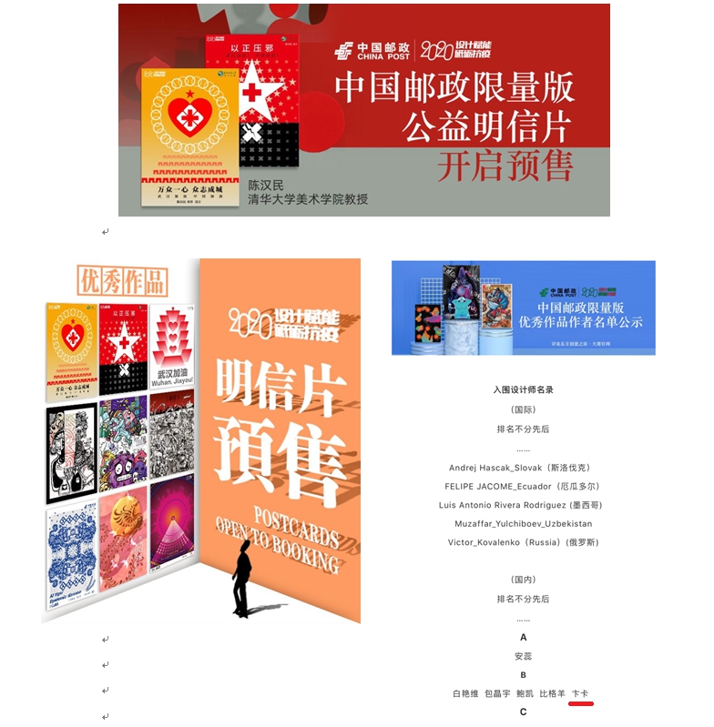 活动受到社会各界热情高涨的参与者踊跃投稿,大赛组委会共收到国内外两万多名设计师创作的近三万件作品,其中不乏设计界泰斗级大师陈汉民等前辈,也有众多享有盛誉的设计工作室和独立设计师的投稿。经过评审委员会专家审慎评选,433件优秀作品进入本次中国邮政定制版公益明信片作品库。威尼斯官网艺术学院教师卞卡老师的作品有幸入库。