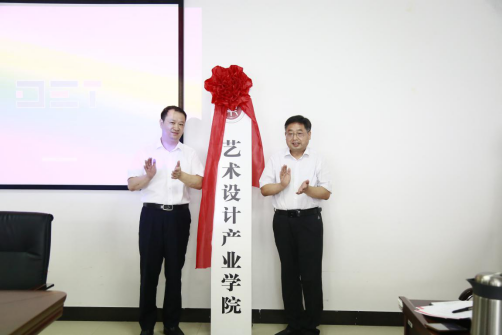 校长罗士喜与河南省顶极汇装饰设计有限公司董事长熊书国为艺术设计产业学院成立揭牌。