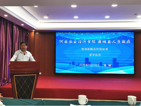 在校地战略合作框架协议签约仪式上,罗士喜对商城县委县政府的合作诚意表示感谢,他分析了河南农牧业发展现况,指出河南农牧业发展对高端人才、前沿技术需求旺势。罗士喜指出,红色基因是我们党始终立于不败之地的关键所在,学校肩负着传承红色基因的重任,始终坚持为党育人、为国育才,为社会企业、行业、产业输送优秀人才,提供实用技术,培养国家栋梁;学校立足河南省情、对接人才需求,坚持牧工商一体化融合发展的办学道路,围绕畜牧业、食品加工业等,整合优势资源,推动教科研成果的转化,提升学校服务社会的能力,实现了政校企“合作发展”“合作办学”“合作育人”,促进大学生创业就业。罗士喜表示,学校将继续以提升服务能力为己任,实现政校企共管共享人才、技术、资源与成果,帮企业破解发展难题,为区域经济社会发展贡献力量。罗士喜强调,企业应树立危机意识、不断创新突破,在行业发展中实现思想引领,技术领先;学校将更加积极地投身社会服务,在服务经济社会发展中提升育人能力和科研水平,提高政校企合作的实效性和可持续性。