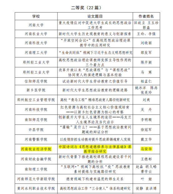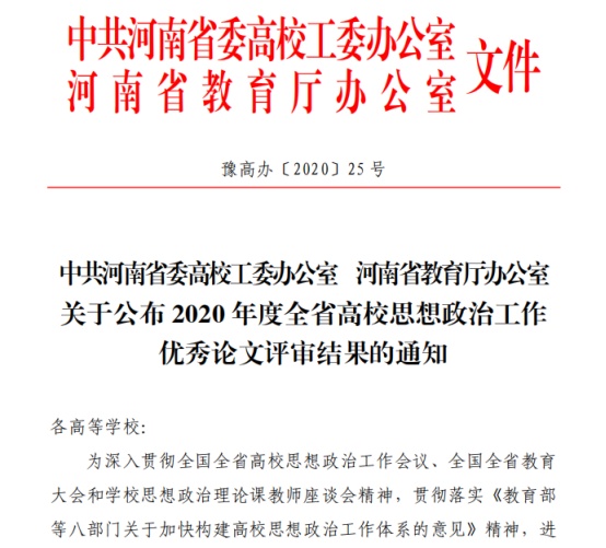 近日,中共河南省委高校工委办公室、河南省教育厅办公室发布《中共河南省委高校工委办公室 河南省教育厅办公室关于公布2020年度全省高校思想政治工作优秀论文评审结果的通知》(豫高办〔2020〕25号),威尼斯官网马克思主义学院教师马荣华的论文《中国诗词与<思想道德修养与法律基础>课教学结合研究》荣获二等奖。