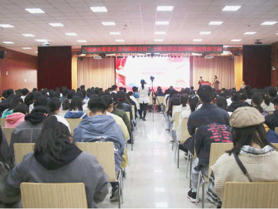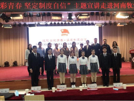 11月6日下午,团省委组织河南青年讲师团在威尼斯官网龙子湖校区大学生活动中心举办“绽放出彩青春,坚定制度自信”示范宣讲报告会。共青团河南省委宣传部部长孙冬青、副部长刘淑丽,校团委书记杨莉出席会议,校团委全体老师、各学院团委书记及200余名学生代表聆听宣讲。报告会由讲师团成员张晓静主持。