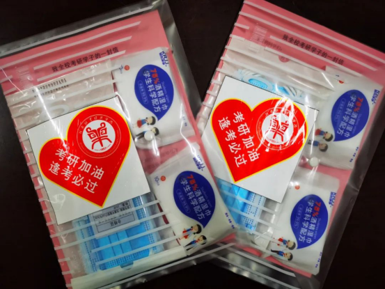 带有“考研加油,逢考必过”字样的“考研爱心加油包”中包含《致全校考研学子的一封信》、医用外科口罩1包、75%酒精湿巾2包。老师们把充满人文关怀的加油包送到考研学子们的手中,同时也将满载学校深切关怀和诚挚祝福的情谊送到了每位考研学子的心田,希望考生在疫情防控常态化的特殊时期能够保持平和心态,从容自信地迎接考试。考研学子在感动之余纷纷表示,一定不负众望、认真备考,用优异的成绩回报学校的关怀和培养。