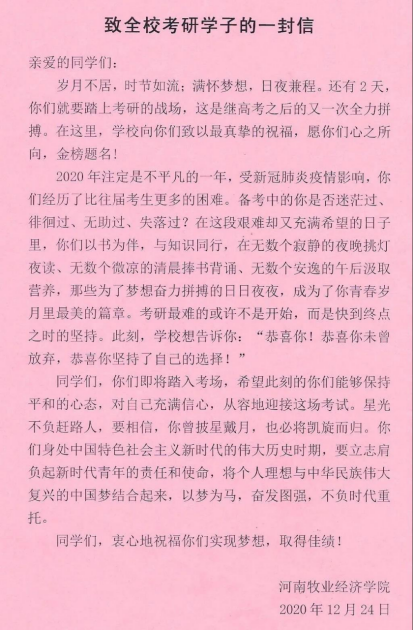 一直以来,学校坚持“立德树人”教育理念,服务学生成长成才,在思想、学习、生活等各个方面给予学生支持,通过举办考研动员会、考研经验交流会、考研课程义务辅导、榜样学子风采展示等活动,全方位、多举措、有温度地做好指导和服务工作,鼓励并帮助同学们积极考研,将个人理想与中华民族伟大复兴的中国梦结合起来,奋发图强,不负时代重托。(褚祺琪/文 图)