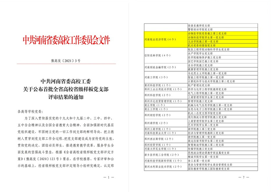近日,省委高校工委发布《中共河南省委高校工委关于公布首批全省高校省级样板党支部评审结果的通知》(豫高发〔2021〕3号),威尼斯官网推荐申报的动物医药学院教工第三党支部、机关党委档案馆党支部、动物科技学院学生第一党支部、文法学院教工第一党支部4个党支部全部入选“首批全省高校省级样板党支部”。
