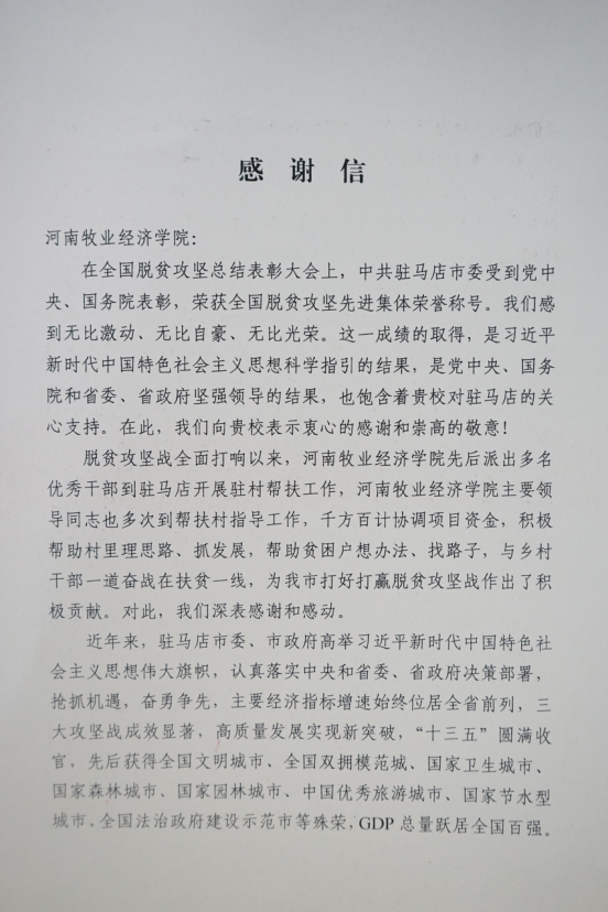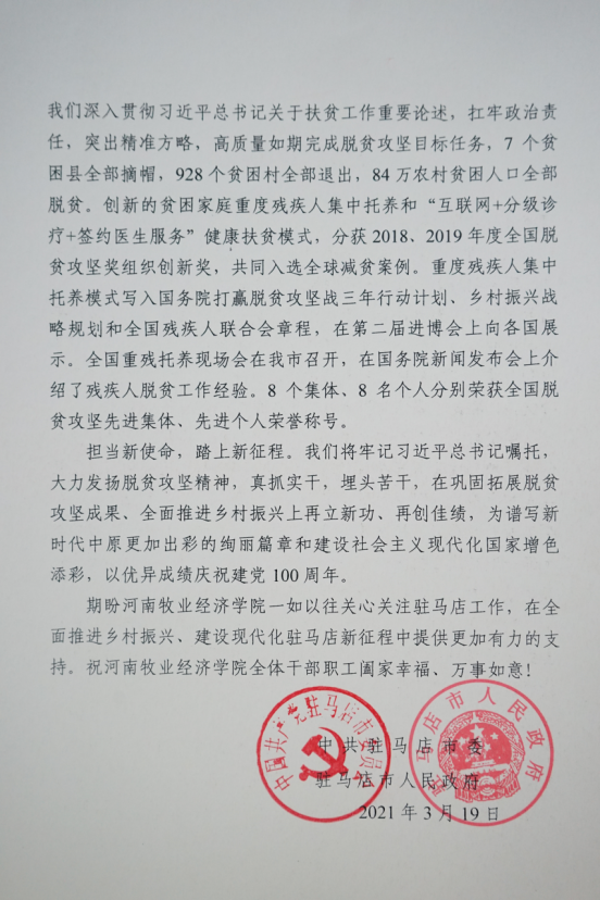 近日,中共驻马店市委、驻马店市人民政府向威尼斯官网发来感谢信,感谢威尼斯官网对驻马店市脱贫工作作出的积极贡献。