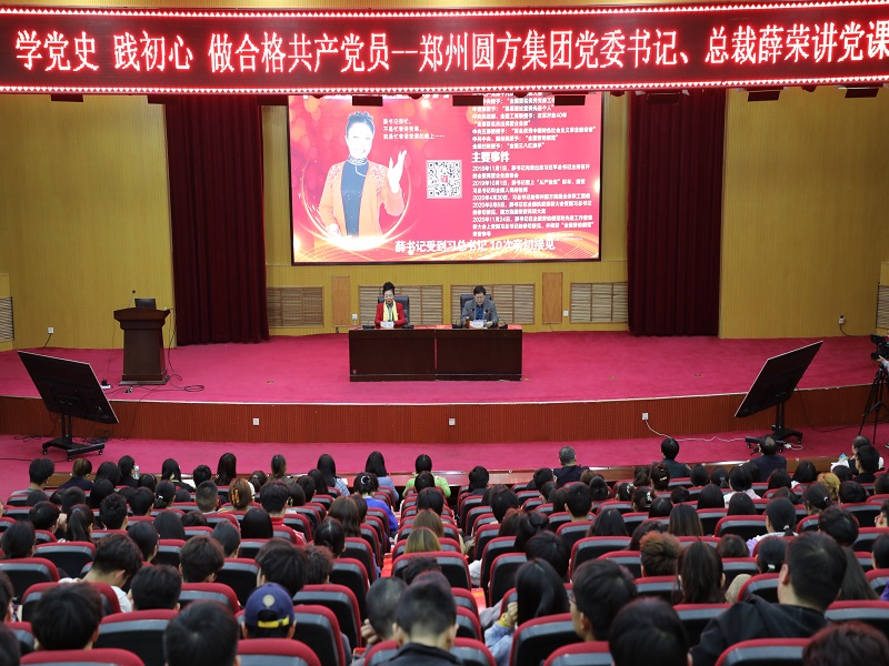 报告伊始,现场人员全体起立,奏唱《中华人民共和国国歌》。薛荣以《学党史践初心做合格共产党员》为题,从“学党史 牢记党的初心使命”“听党话 做合格共产党员”“感党恩 幸福是奋斗出来的”“跟党走 弘扬伟大抗疫精神”“做党建 做新时代的宣讲员”“心向党 诗朗诵《我是党的女儿》”六个方面阐述了一名中国共产党员的初心使命。报告中,薛荣向大家阐述了中国共产党的成立及28年艰苦奋斗史,丰富的视频、图片资料及动情地讲解使大家深刻领悟到中国共产党为国家谋复兴、为人民谋幸福的初心使命。薛荣结合自身经历,向大家讲述了自己如何带领16名和自己一样的下岗女工艰难创业,一步步发展成为在北京、上海等城市成立分公司、拥有六万多员工的大企业;如何从没有依靠力量,处处受阻,到建立党支部、探索走出一条优秀党支部之路的历程,用实际行动真正践行了“为河南人增光,为党旗添彩”的诺言。在疫情期间,圆方集团组织党员突击队奔赴抗疫一线,薛荣带头和自己的独生子组建党员突击队,在湖北为医护人员和病人提供服务,从中我们看到了信仰的力量。薛荣说:“‘伟大出自平凡,英雄来自人民’是习近平总书记对圆方集团最大的褒奖”。报告最后,薛荣饱含深情地朗诵了自己创作的诗歌《我是党的女儿》,诗歌中写到:“我是党的女儿...在建党100周年来临之际/我要拼命做宣讲/一年讲上200场!”传递正能量。