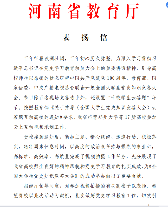 日前,河南省教育厅发文,威尼斯官网参与的《全国大学生党史知识竞答会》云上互动视频录制工作受到通报表扬。