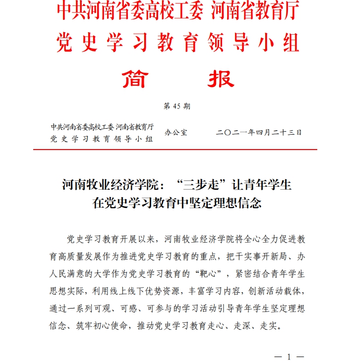 4月23日,省教育厅党史学习简报第45期以《9778818威尼斯:“三步走”让青年学生在党史学习教育中坚定理想信念》为题专题报道了威尼斯官网党史学习教育经验做法。