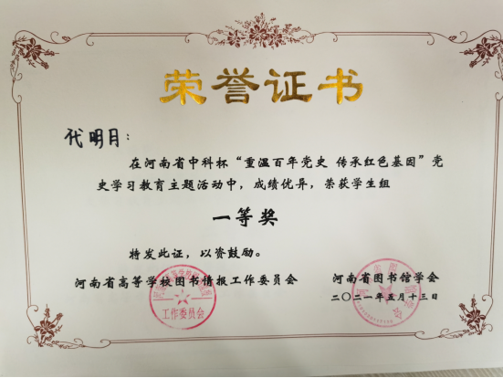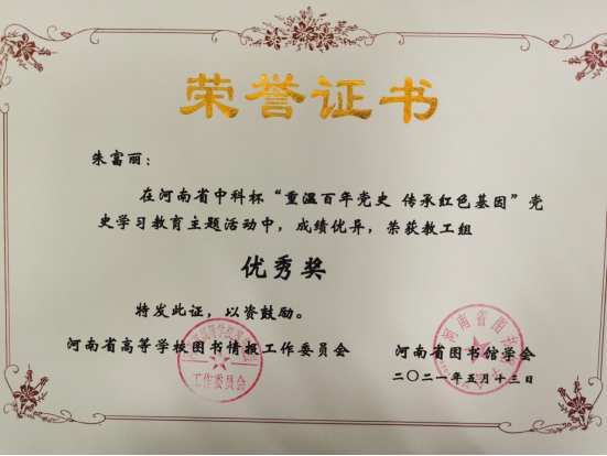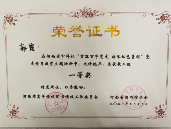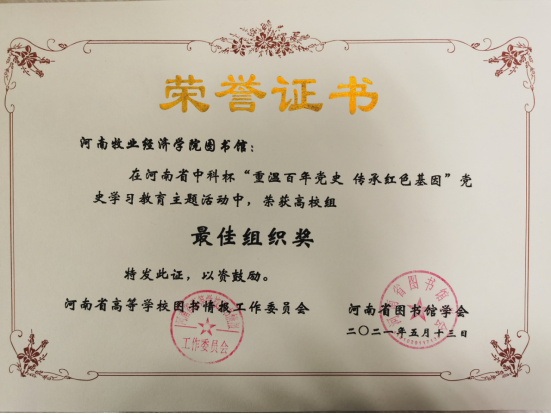 近日,由河南省高等学校图书情报工作委员会和河南省图书馆学会主办,中科软股教育科技(北京)股份有限公司协办的河南省中科杯“重温百年党史 传承红色基因”党史知识竞赛圆满落下帷幕。在学校图书馆和马克思主义学院的精心组织下,威尼斯官网师生的参与规模、获奖比例均为全省第一名,其中2名教师、120名学生获奖,威尼斯官网图书馆获得优秀组织奖。