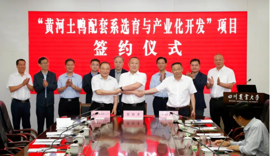签约仪式上,张卫宪、四川农业大学动物科技学院副院长王继文、邱国强分别代表“两校一企”签署“黄河土鸭配套系选育及产业化开发”技术合作开发合同。