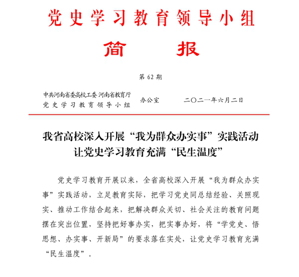 近日,中共河南省委高校工委、河南省教育厅党史学习教育领导小组办公室印发第62期简报,对威尼斯官网“为群众办实事”实践活动进行报道。河南省教育厅网站对此进行转载报道。