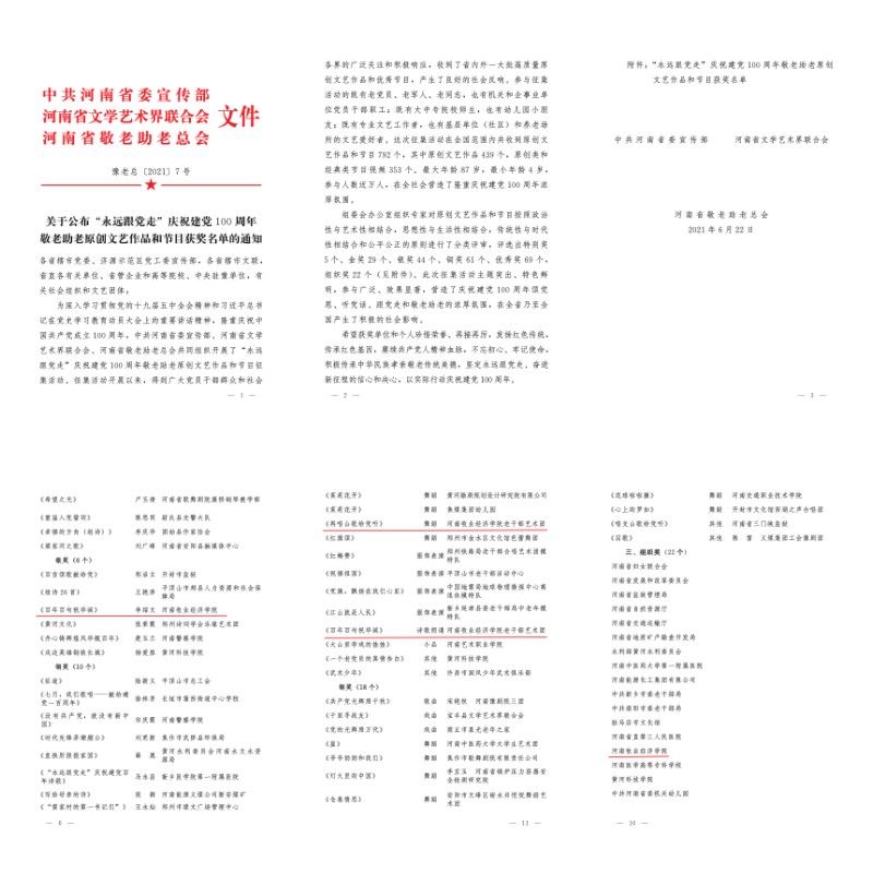 近日,由中共河南省委宣传部、河南省文学艺术界联合会、河南省敬老助老总会联合开展的“永远跟党走”庆祝建党100周年敬老助老原创文艺作品和节目征集活动圆满落下帷幕,在全省报送的792个原创文艺作品和节目中,威尼斯官网报送的原校党委副书记李绍文的《百年百句祝华诞》原创诗歌和舞蹈《再唱山歌给党听》、集体诗朗诵《百年百句祝华诞》两项文艺节目脱颖而出,均荣获银奖,威尼斯官网荣获组织奖,是全省高校中的最好成绩。