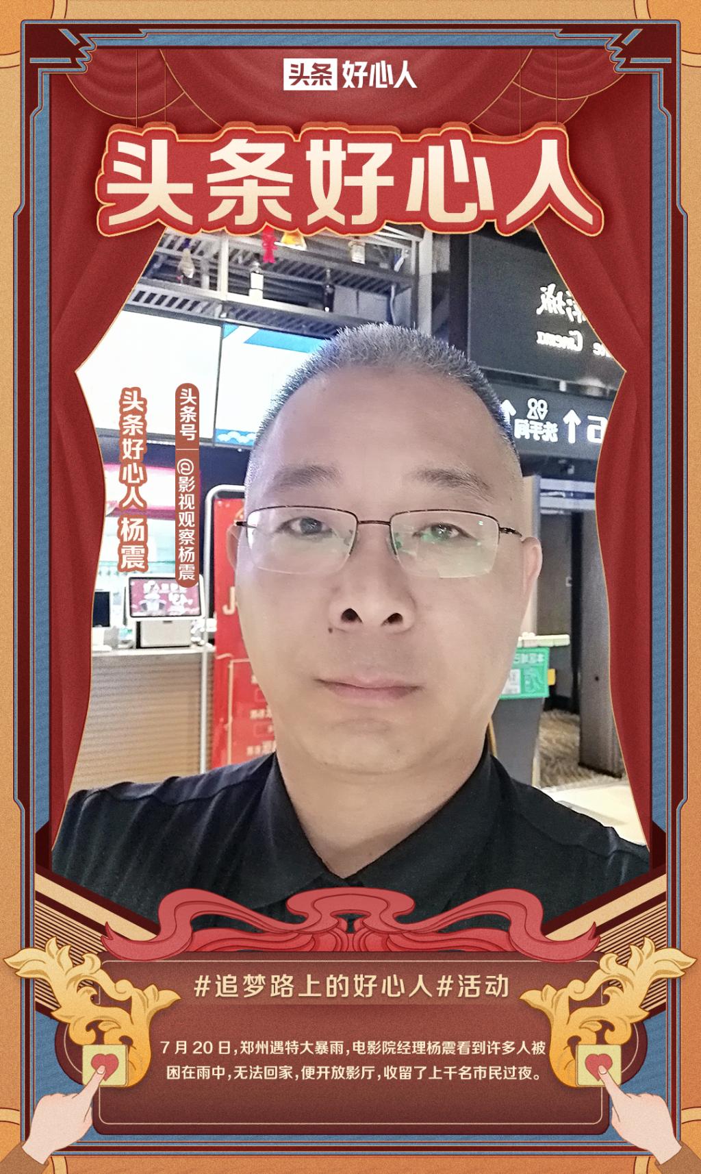 7月20日18时左右,下班后的杨震准备乘坐地铁回家。但前往地铁口的过程中,身高一米七的他发现积水已经漫过大腿,行走已变得困难。于是,他在地铁口停留了两个小时,发现雨越下越大,于是决定返回影城,接纳受困人员。当时,他不确定影城是否有电、领导是否同意,在他与领导、商场管理人员沟通协调后,他将被困人员留在了影城避难。随后,他把现场滞留情况以及联系方式公布在了多个影迷群里。通过他人的转发,越来越多的人联系上了杨震寻求帮助,杨震都欣然同意,并为滞留者提供了手机充电、热水等服务,还将孕妇安排在卡座休息,将男女分别安排到不同的放映厅。