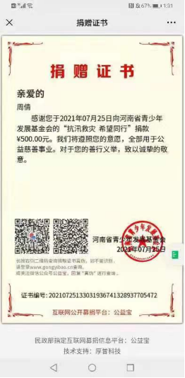 校团委周倩老师捐款500元,她说:“多处基础设施被毁、农田被淹、房屋倒塌,很多人无家可归,武警部队,解放军,人民子弟兵,全国各地爱心人士纷纷驰援河南,各条战线的爱心人士纷纷捐钱捐物,我作为一名教师,一名拥有18年党龄的老党员,理应献出自己的一份爱心。”