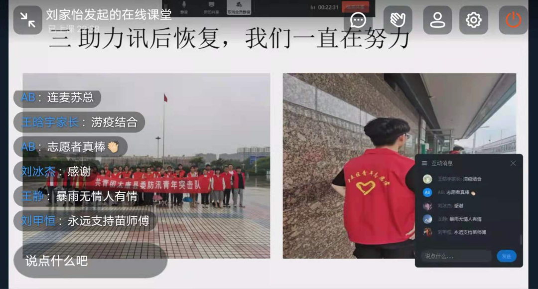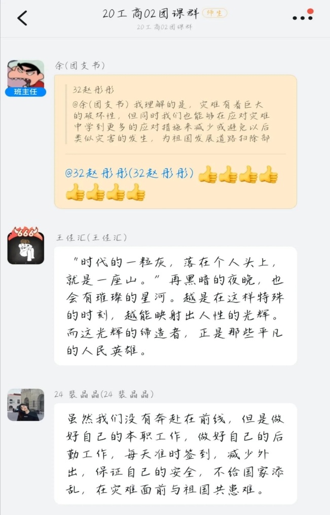 文法学院各班级团支部结合各种新闻资源,为学生分析了在家中为灾后整治以及疫情防控贡献自己的一份力量的重要性。让学生感受到中华民族的伟大精神力量是战胜灾情、疫情的有力武器。
