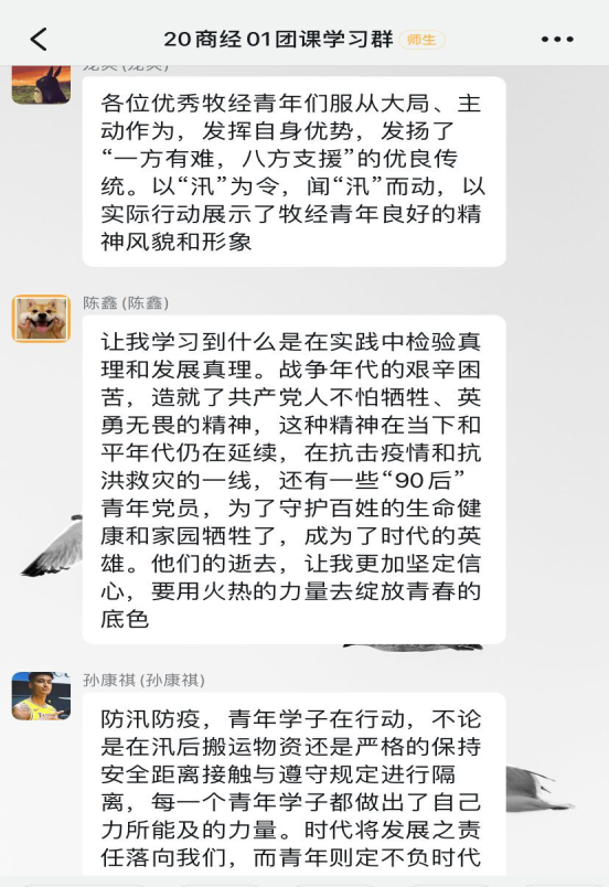 经济与贸易学院各班级团支部团员在团支书的带领下,观看有关防洪和抗疫的短视频,学生感触颇深。观看结束后,团支书提出相关问题,学生也都积极发表自己的看法,团课气氛十分活跃。通过此次网上主题团课,同学们深刻认识到众志成城、防汛抗疫的重要性,树立了防控理念,并掌握一定的疫情防控方法。相信,在接下来的时间里,团员能不惧困难,保护自己,运用知识,科学防疫。