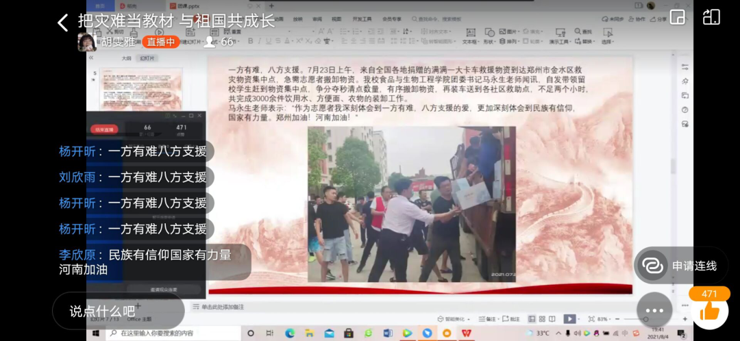 动物科技学院以云课堂的方式开展本次团课。在团课上,各班级团支部讲述了救灾及疫情的相关新闻,呼吁大家为防汛及疫情防控献出自己的一份力。通过本次团课,学生更加明白自己身上的担当及责任,作为大学生,更应通过自身行动,展现时代力量。