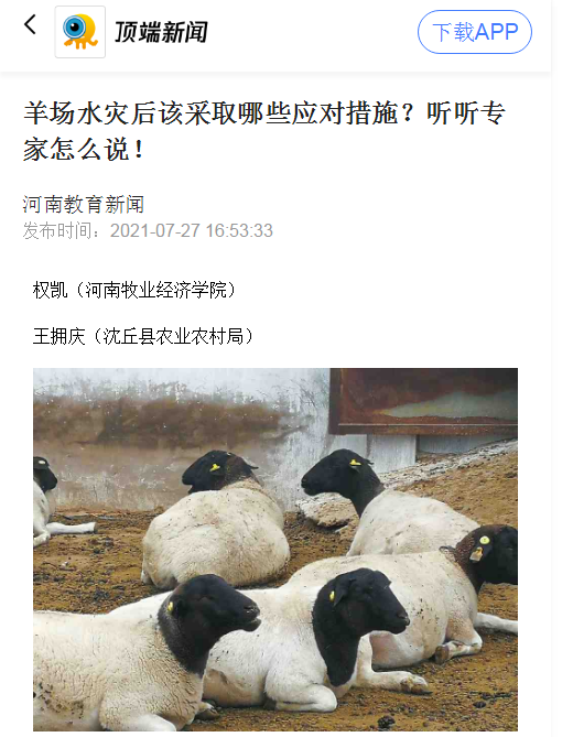 暴雨之后,内涝灾害不仅给畜禽养殖业带来经济损失,还面临疫病风险,为做好灾后复产,九三社员权凯教授在深入了解受灾羊场情况后,指导养殖户对环境进行全面消毒,加强环境控制。对雨水淹过的羊舍、泥土、粪便及各种污物,进行清扫、清洗和消毒,确保不留死角。他建议养殖场充分发挥自身能动性,做好灾后自救,及时转移受灾畜禽、及时进行无害化处理、及时处理霉变饲草料,尽可能减少水灾给养殖户带来的经济损失。
