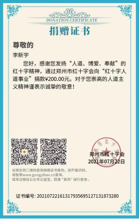 党外人士李新宇在得知郑州红十字会捐款渠道后,立刻向郑州红十字会捐款200元,以尽自己的一份心意。
