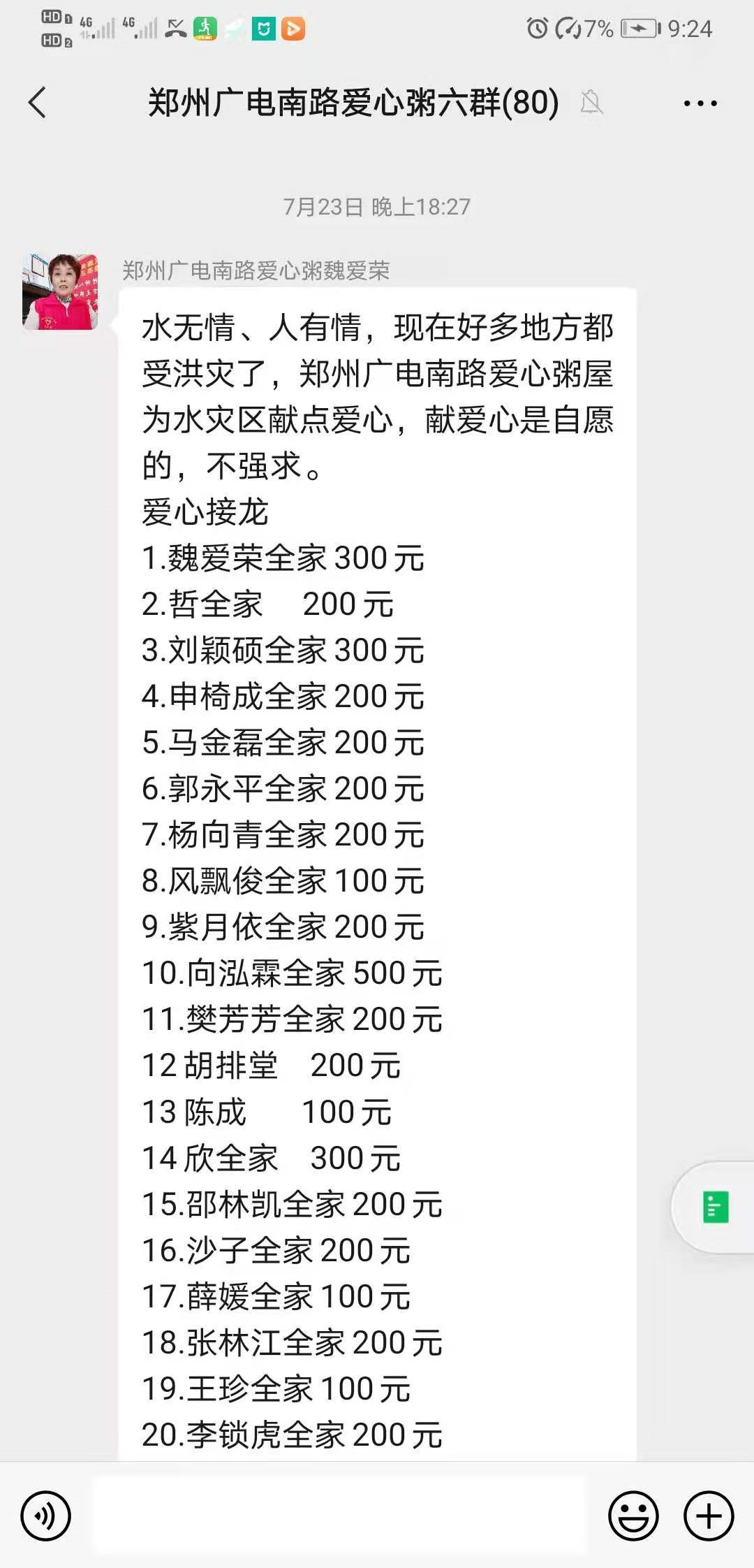 致公党党员张林江积极为受灾群众捐款200元,并积极发起郑州广电南路爱心粥屋为灾区开展捐款救助活动。组织爱心人士为新乡卫辉灾区捐款共计10700元,深入新乡卫辉田湾村,看望灾区灾民600多位,为灾民送去了小米1000斤、大米1550斤、馒头500个。