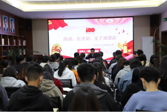 10月21日下午,副校长姚毅以《南湖、长津湖、龙子湖漫谈——让党史之光照耀未来》为题,在英才校区图书馆一楼社会主义思想文库为物流与电商学院师生讲授党史学习教育专题思政课。物流与电商学院党政领导、辅导员老师和学生代表聆听。思政课由物流与电商学院党委副书记陈永刚主持。