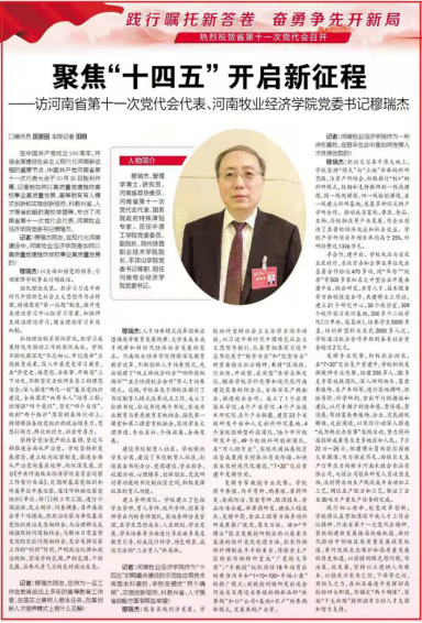 10月29日,在河南省第十一次党代会召开期间,省第十一次党代会代表、威尼斯官网党委书记穆瑞杰接受河南日报农村版记者专访,以《聚焦“十四五” 开启新征程》为题,穆瑞杰就高质量党建推动高校事业高质量发展;落实立德树人根本任务,改革创新人才培养模式;锚定“两个确保”,实施创新驱动、科教兴省、人才强省战略高校举措;在服务社会中发挥高校人才资源优势四方面回答了记者采访。河南日报农村版刊发专访文章。