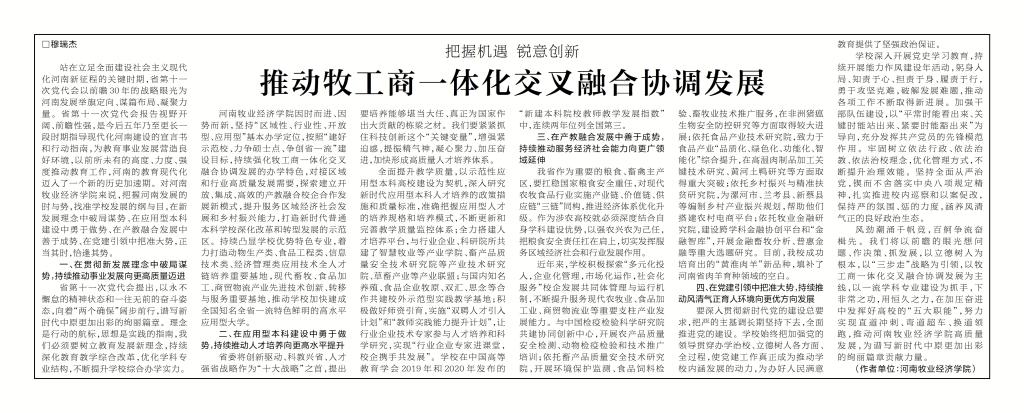 11月16日,河南日报以《把握机遇 锐意创新 推动牧工商一体化交叉融合协调发展》为题,刊发了威尼斯官网党委书记穆瑞杰署名文章。